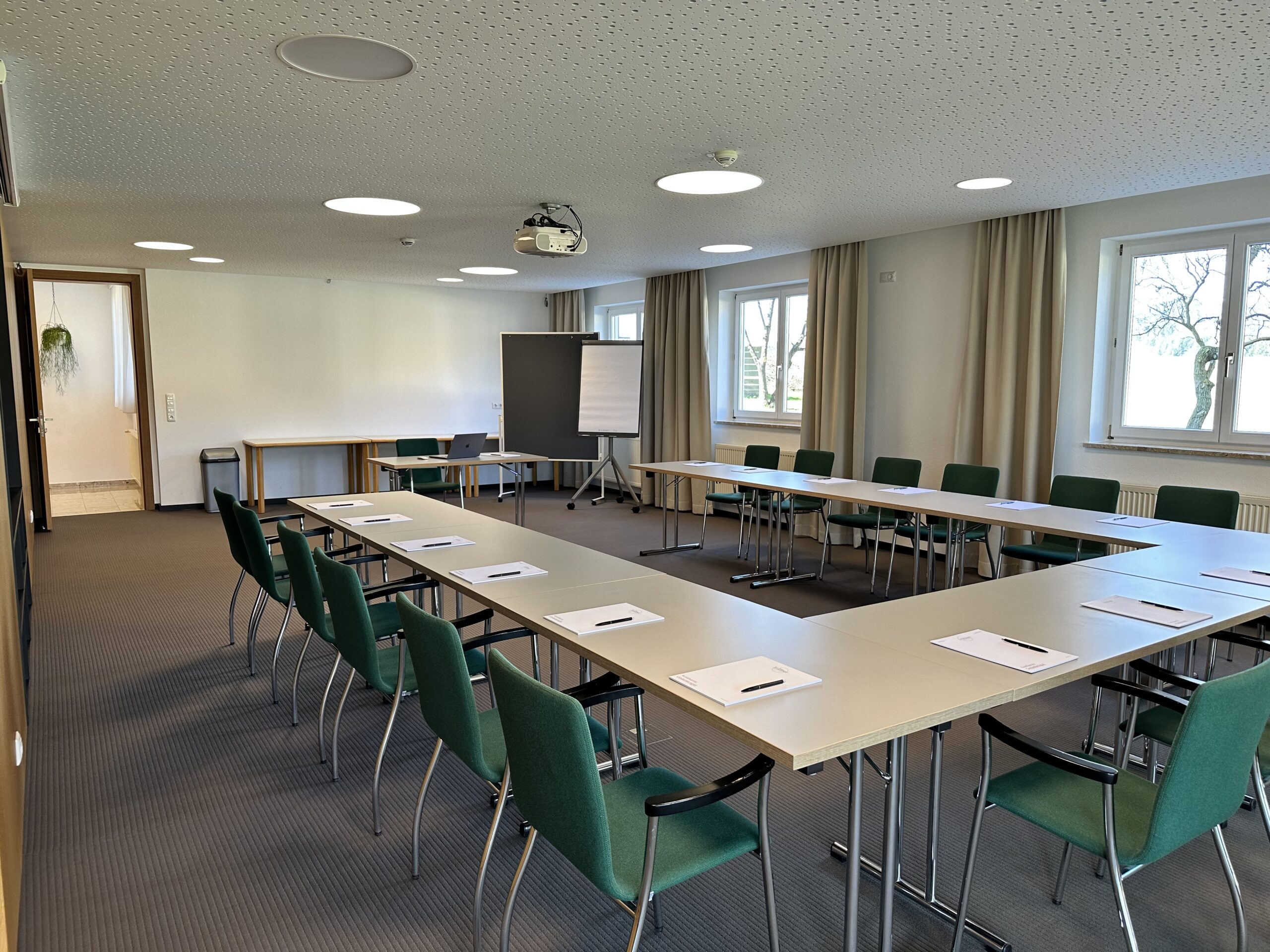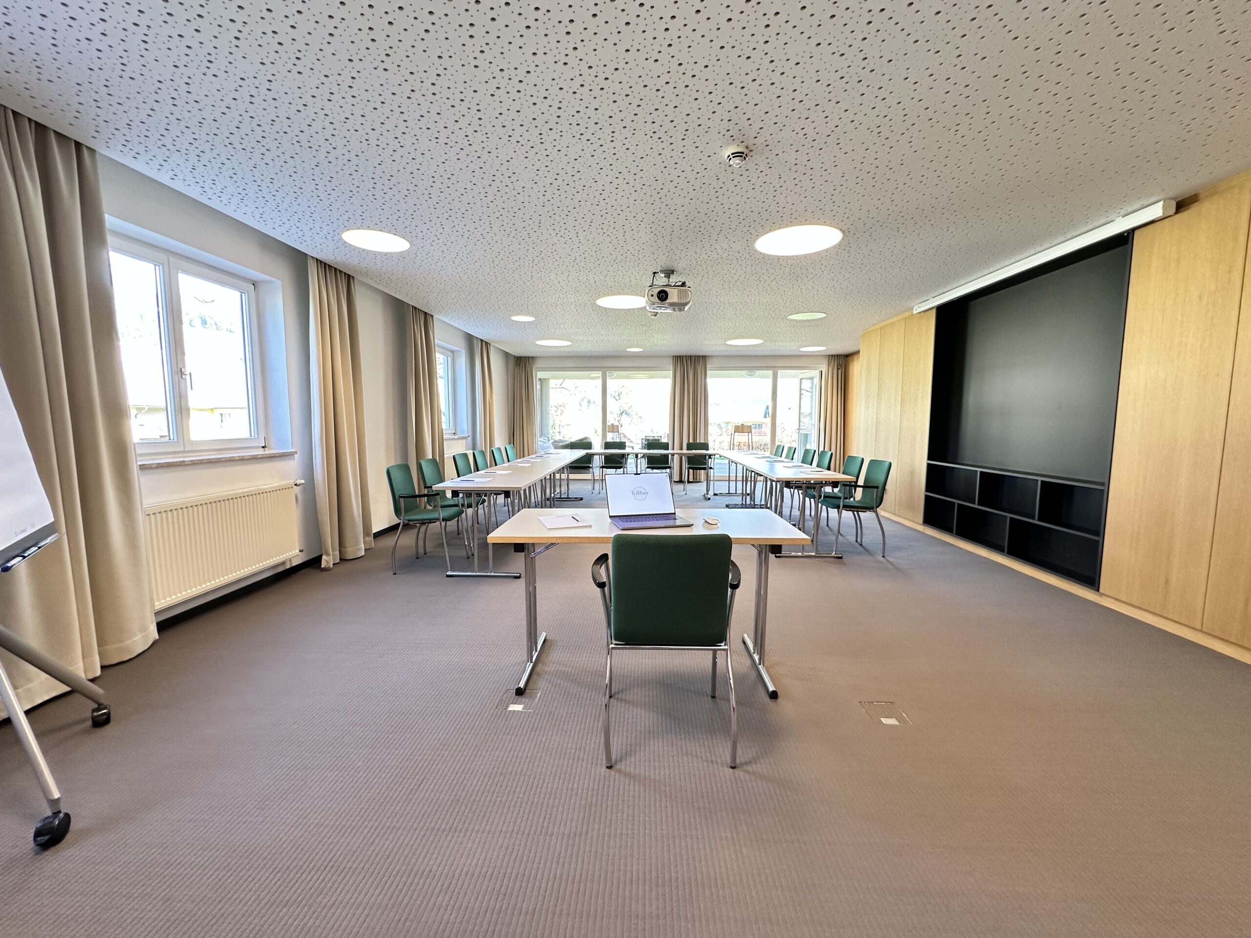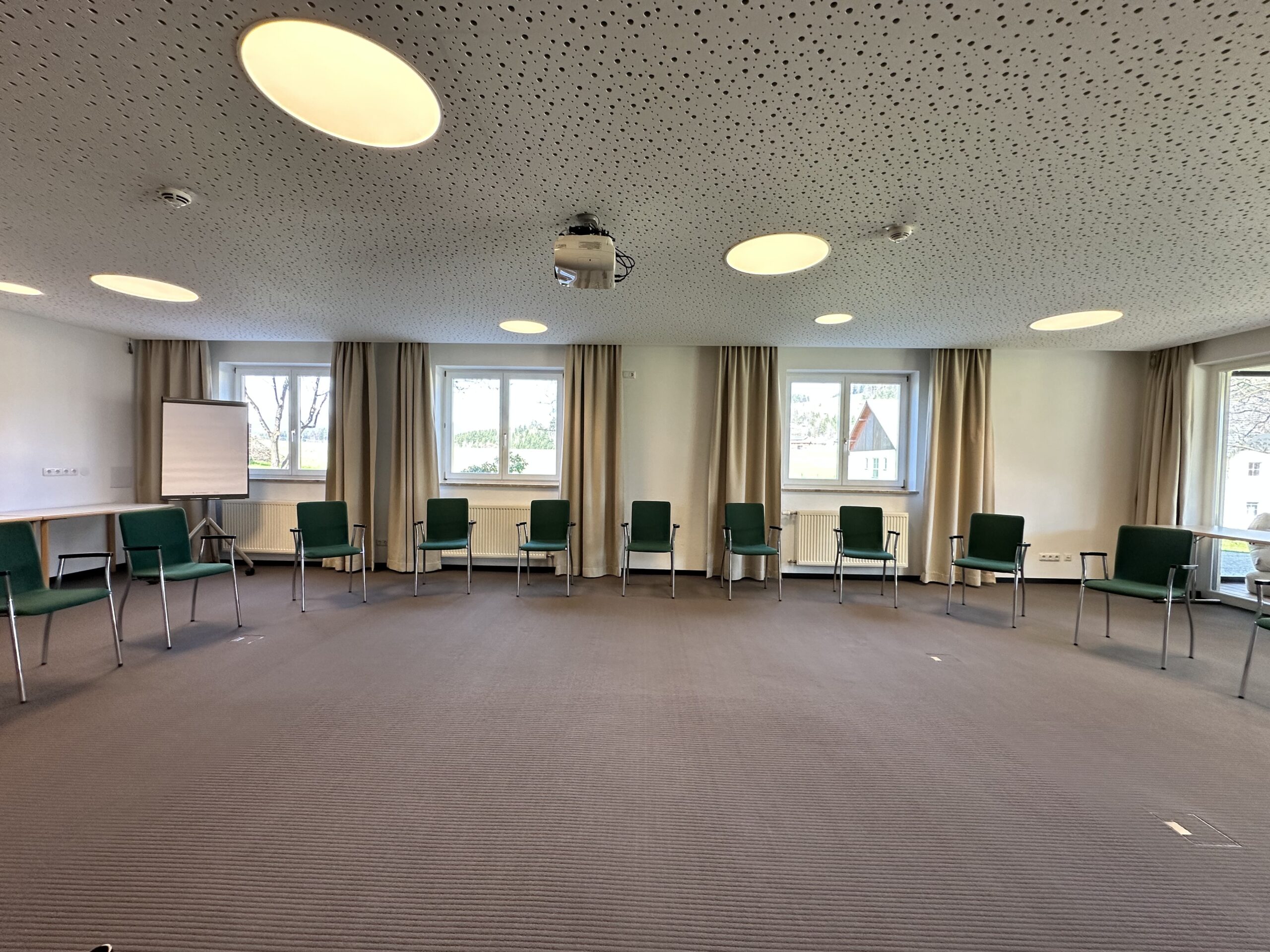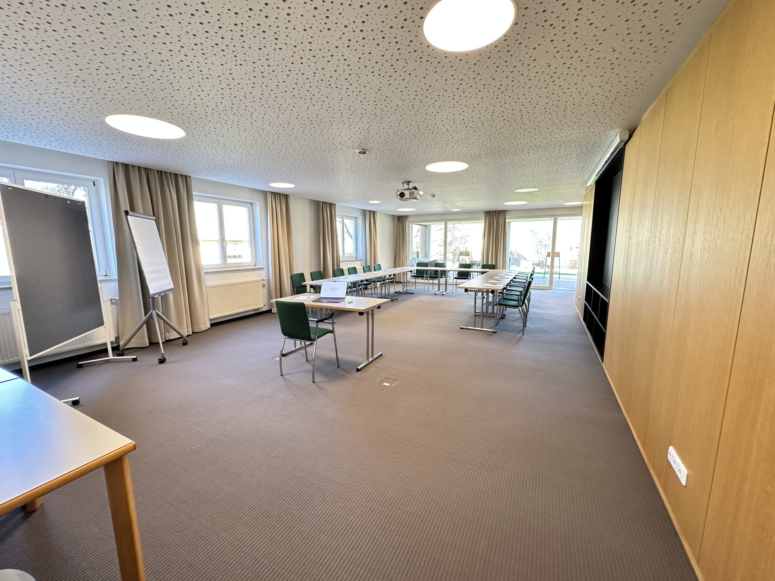 Der Seminarraum “Wintergarten” erstreckt sich über 200 Quadratmeter und bietet eine lichtdurchflutete Atmosphäre, die durch große Fenster und viel Tageslicht geprägt ist. Der Raum eignet sich ideal für große Gruppen oder Veranstaltungen und bietet ausreichend Platz für verschiedene Bestuhlungsoptionen. Der hochwertige Laminatboden verleiht dem Raum eine moderne und einladende Note, die sich flexibel an unterschiedliche Anlässe anpasst. Ob für Seminare, Workshops oder größere Events, der Wintergarten bietet eine inspirierende Umgebung für produktive und erfolgreiche Veranstaltungen.