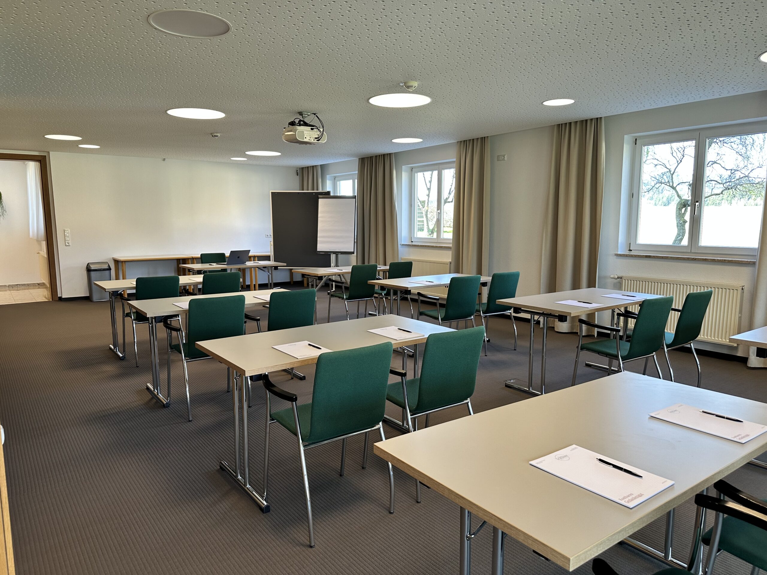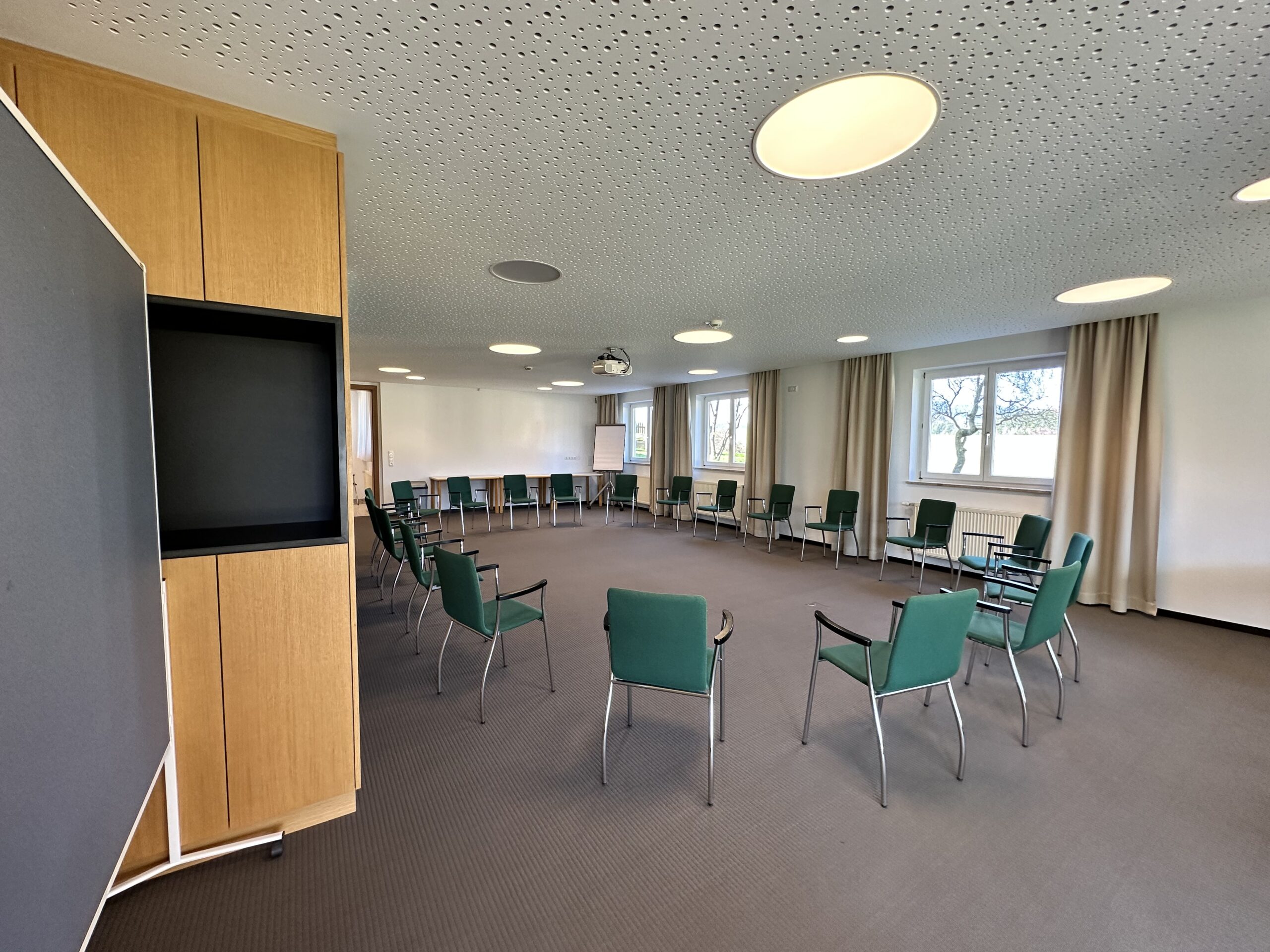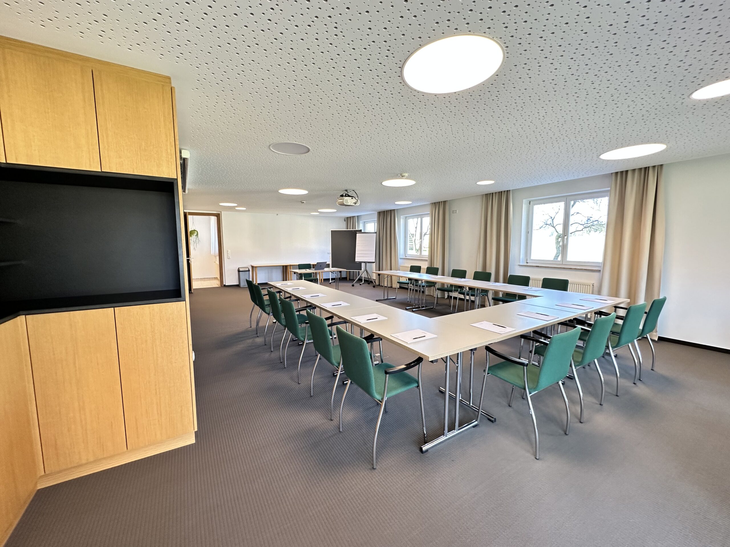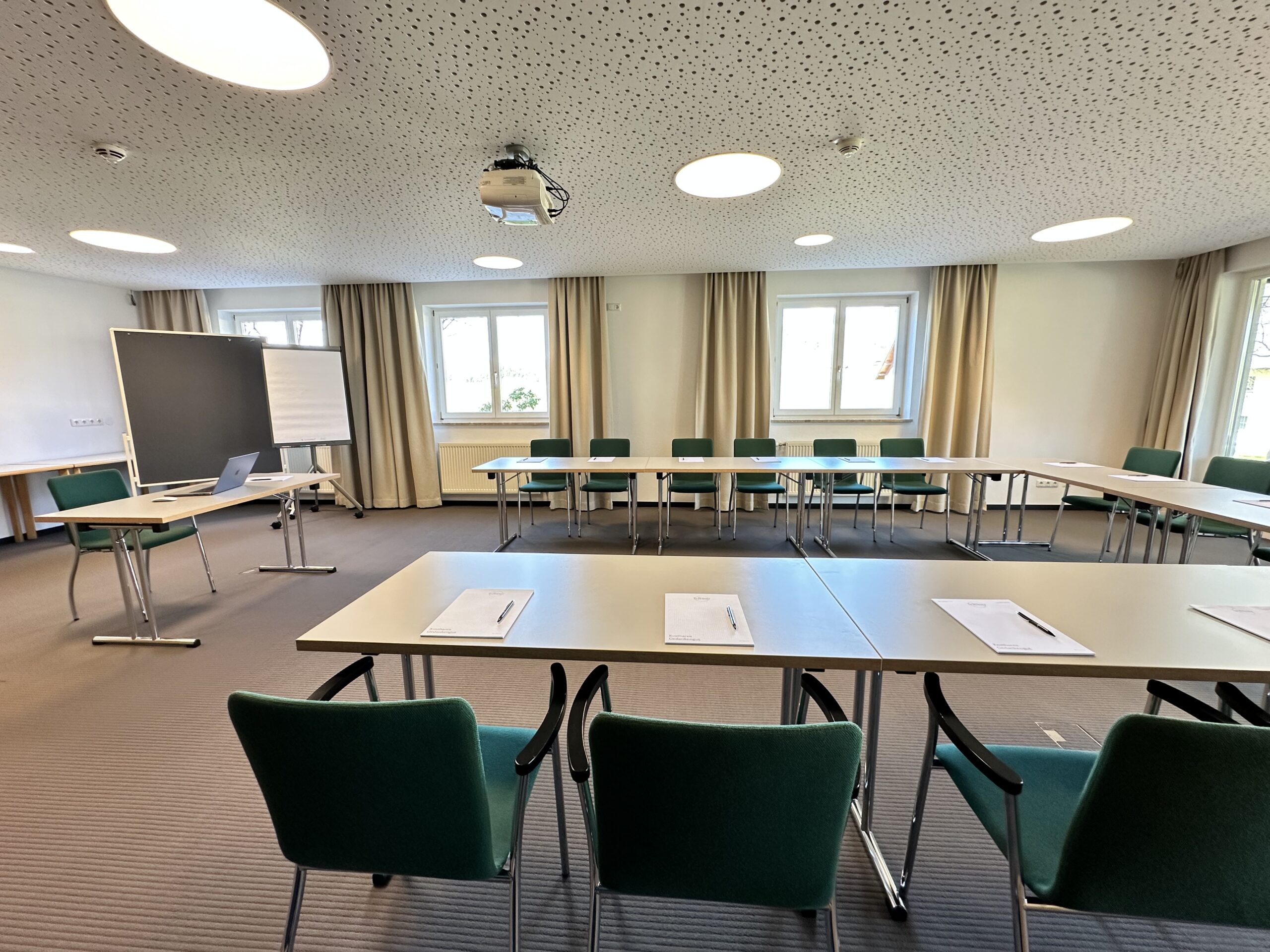 Der Seminarraum “Wintergarten” erstreckt sich über 200 Quadratmeter und bietet eine lichtdurchflutete Atmosphäre, die durch große Fenster und viel Tageslicht geprägt ist. Der Raum eignet sich ideal für große Gruppen oder Veranstaltungen und bietet ausreichend Platz für verschiedene Bestuhlungsoptionen. Der hochwertige Laminatboden verleiht dem Raum eine moderne und einladende Note, die sich flexibel an unterschiedliche Anlässe anpasst. Ob für Seminare, Workshops oder größere Events, der Wintergarten bietet eine inspirierende Umgebung für produktive und erfolgreiche Veranstaltungen.